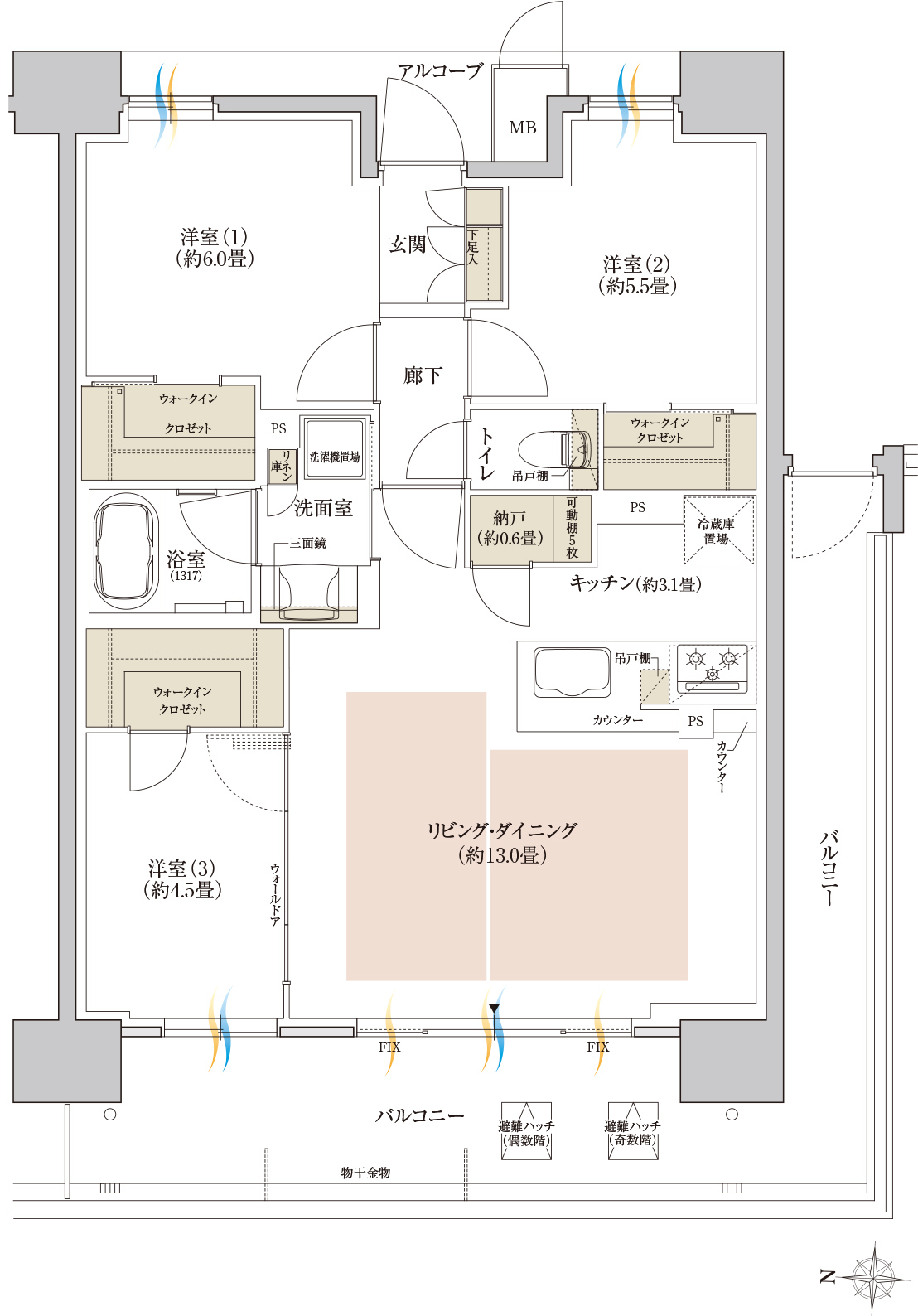 - 2洋室3室すべてにウォークインクロゼットを配置。キッチンには納戸を確保。
