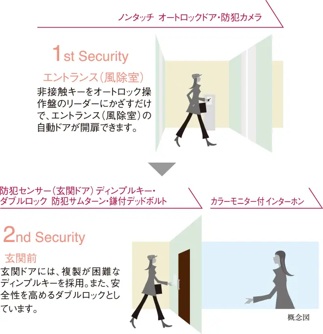 建物エントランスから玄関まで、2段階で安全を見守るセキュリティを採用しました。