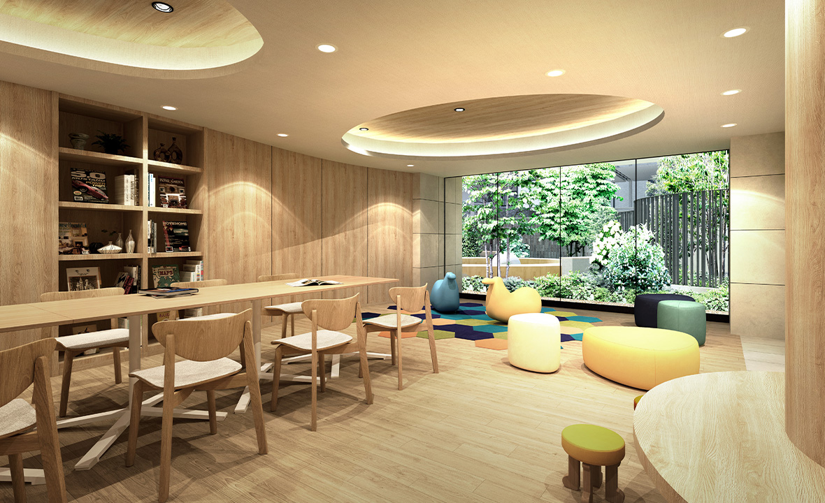 中庭を見晴らすガーデンライブラリーは、大きな本棚と窓外に広がる緑が印象的な空間。 青山ブックセンターが選書を手掛け、リクエストを聞きながら“読みたい本が並ぶ本棚”を入居者の方々と共に作り上げていく予定です。
