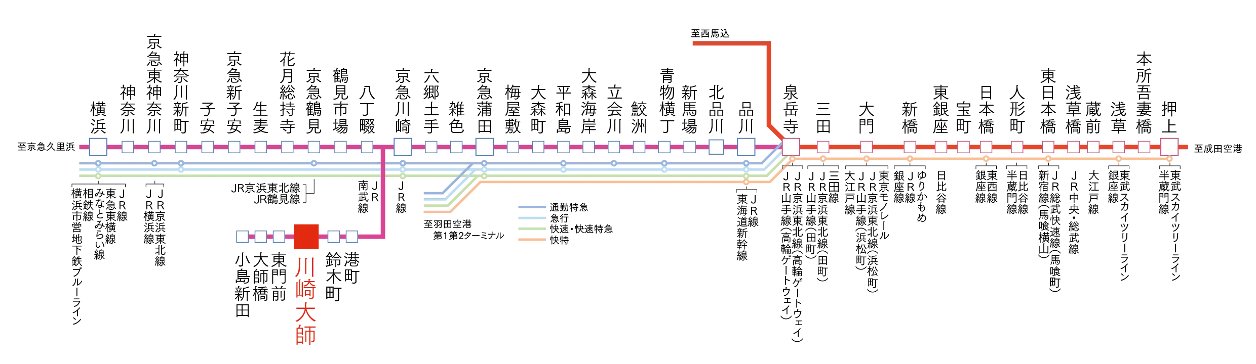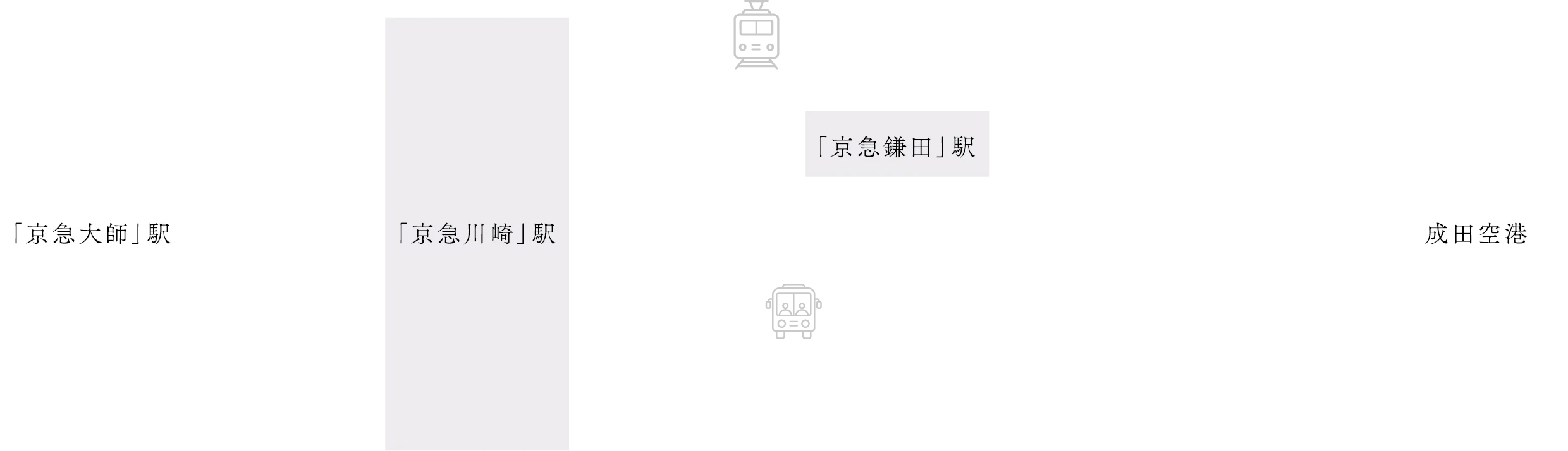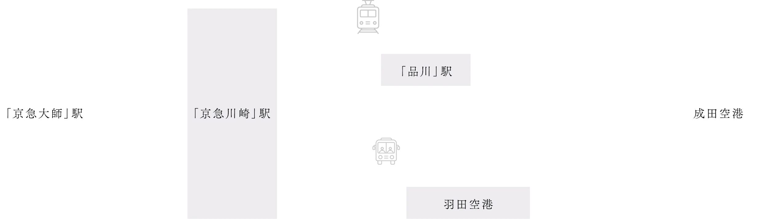 ※「京急川崎」駅/京急大師線直通。「品川」駅 / 京急大師線利用、「京急川崎」駅で京急本線特急に乗換。「横浜」駅 / 京急大師線利用、「京急川崎」 駅で京急本線特急に乗換。「羽田空港 第1・第2ターミナル」駅 京急大師線利用、「京急川崎」駅で京急本線特急に乗換、「京急蒲田」駅から京急空港線特急または急行利用。