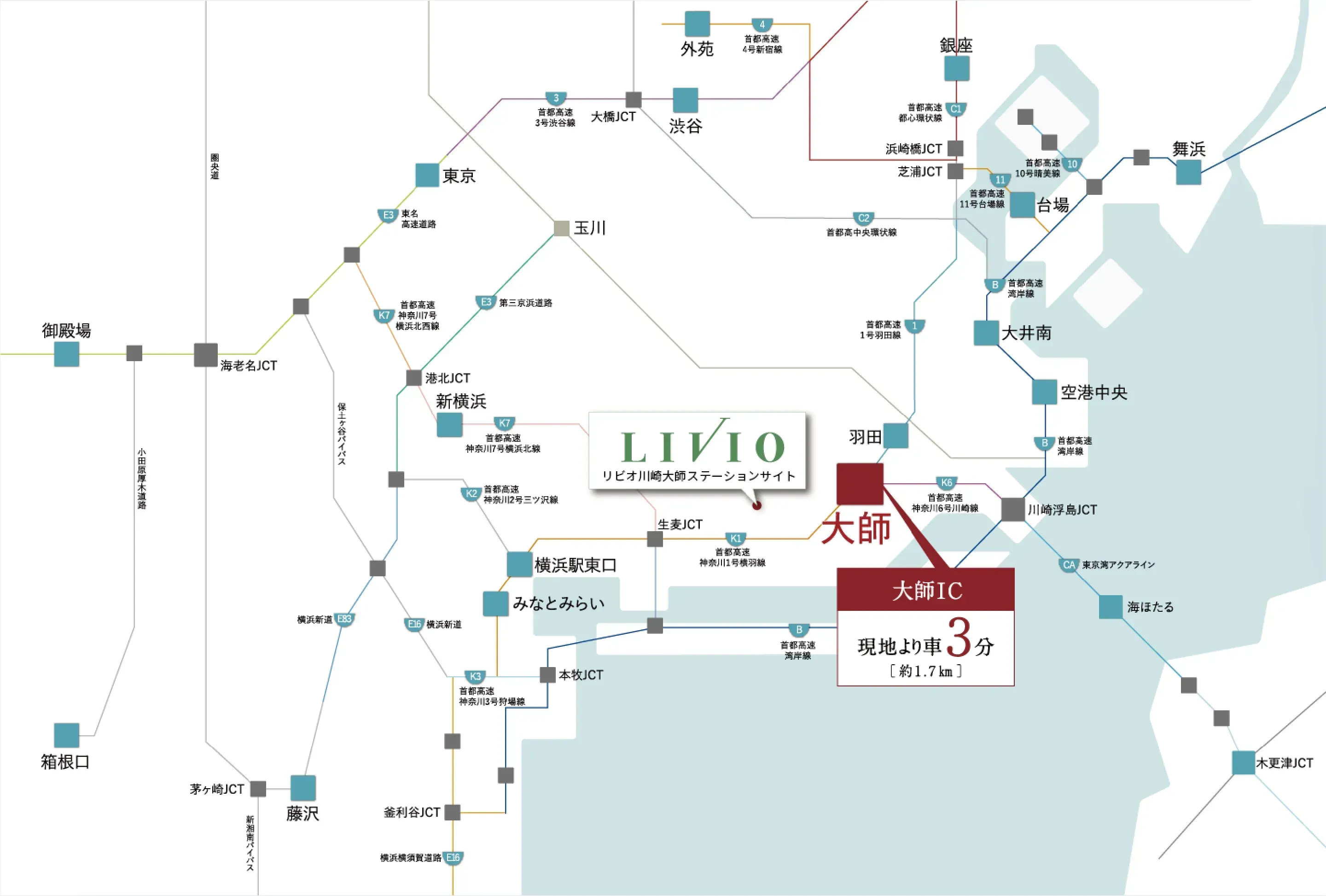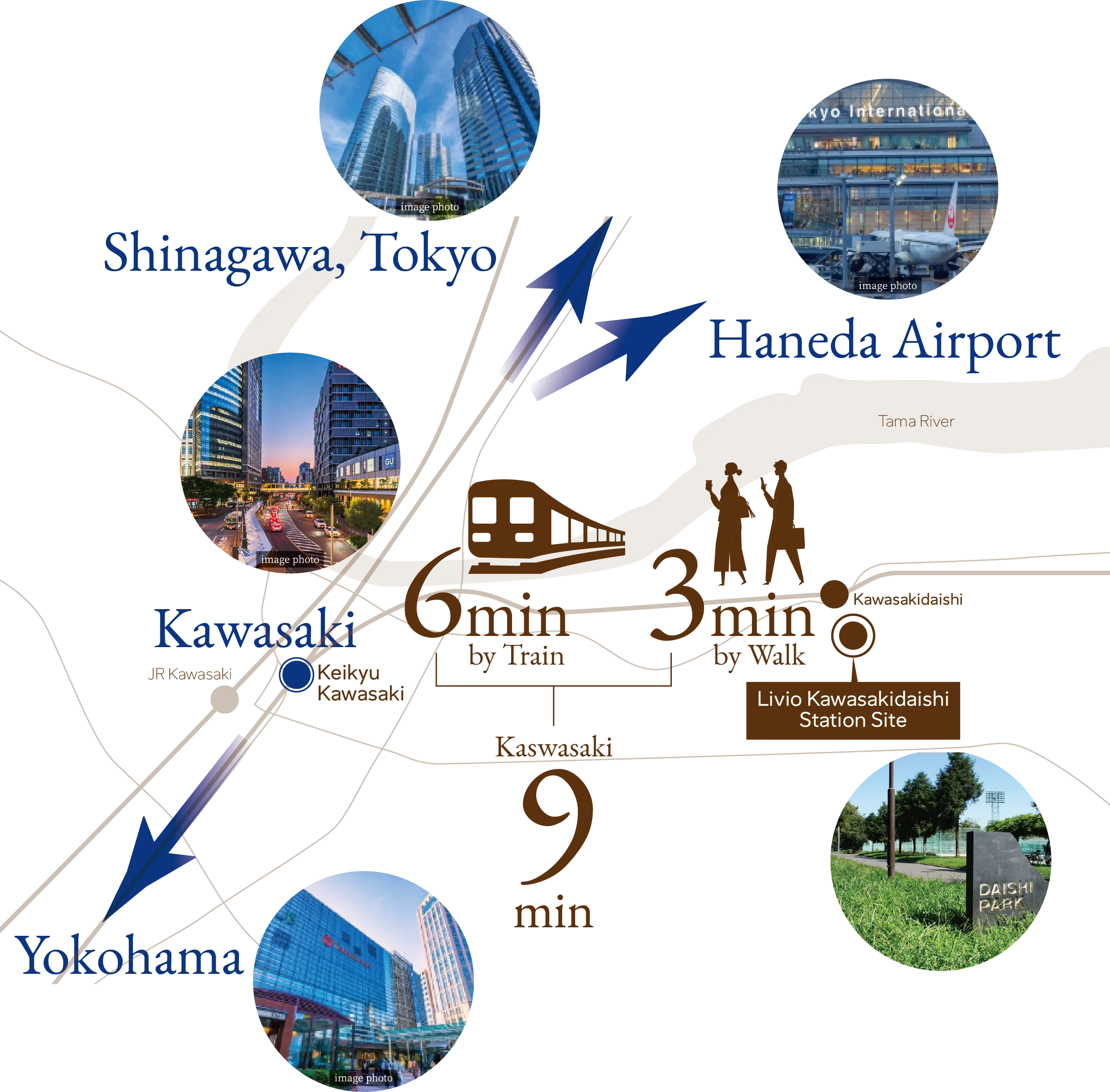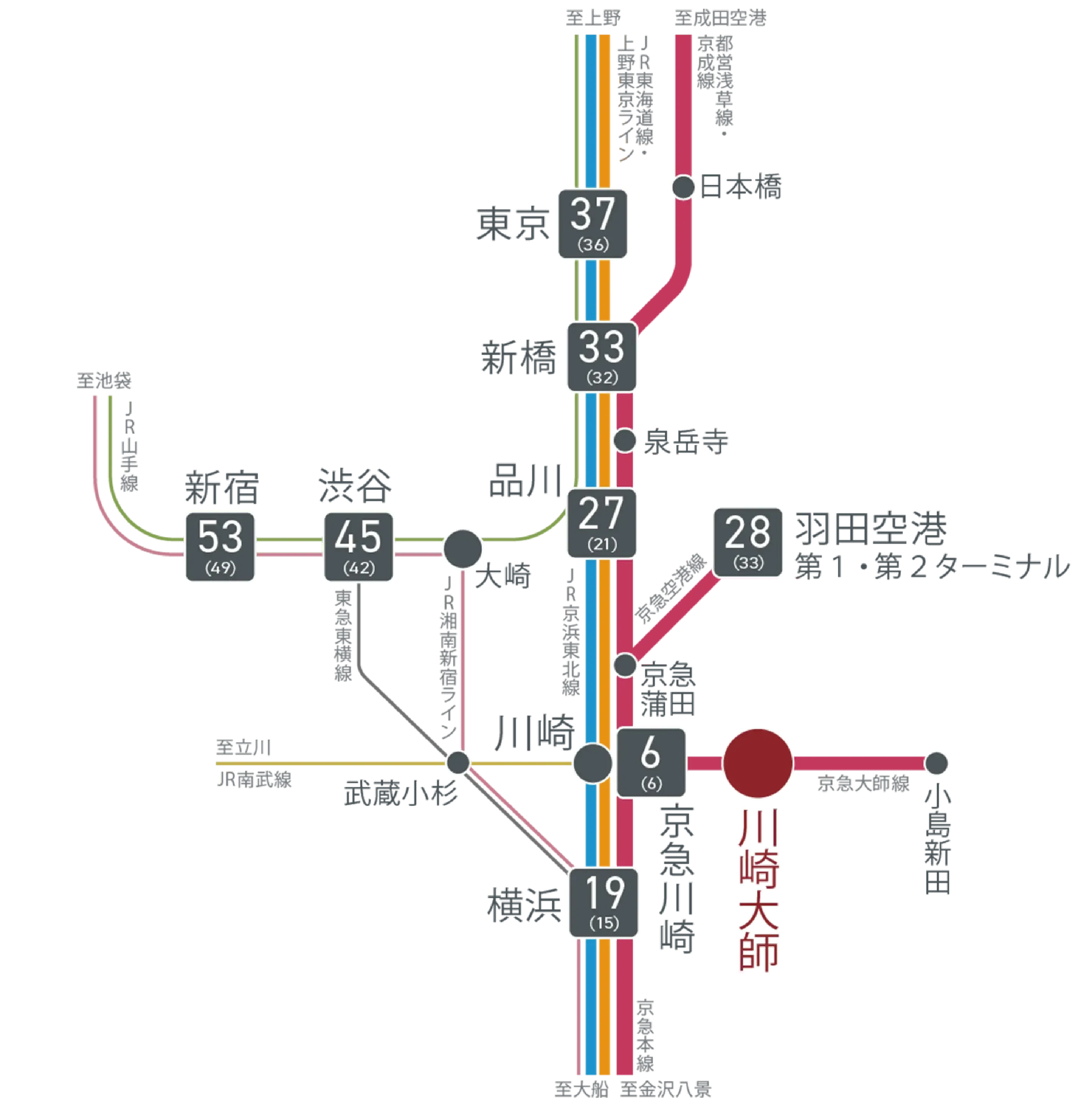 ※「京急川崎」駅/京急大師線直通。「品川」駅 / 京急大師線利用、「京急川崎」駅で京急本線特急に乗換。「横浜」駅 / 京急大師線利用、「京急川崎」 駅で京急本線特急に乗換。「羽田空港 第1・第2ターミナル」駅 京急大師線利用、「京急川崎」駅で京急本線特急に乗換、「京急蒲田」駅から京急空港線特急または急行利用。