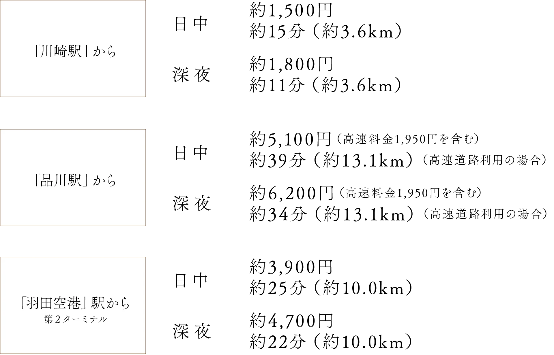 ※タクシー料金は「NAVITIME」タクシー料金検索(2025.5.16現在)を利用しています。日中時間(平日12:00頃)、深夜時間(平日24:00頃)を想定していますが、走行ルートや交通事情によって料金が異なります。乗車時間は道路事情により、実際と異なる場合がございます。深夜料金は午後10時から午前5時までの適用となります。料金は概算の金額です。走行距離で算出しており、信号や渋滞による停車などの時間は考慮しておりません。