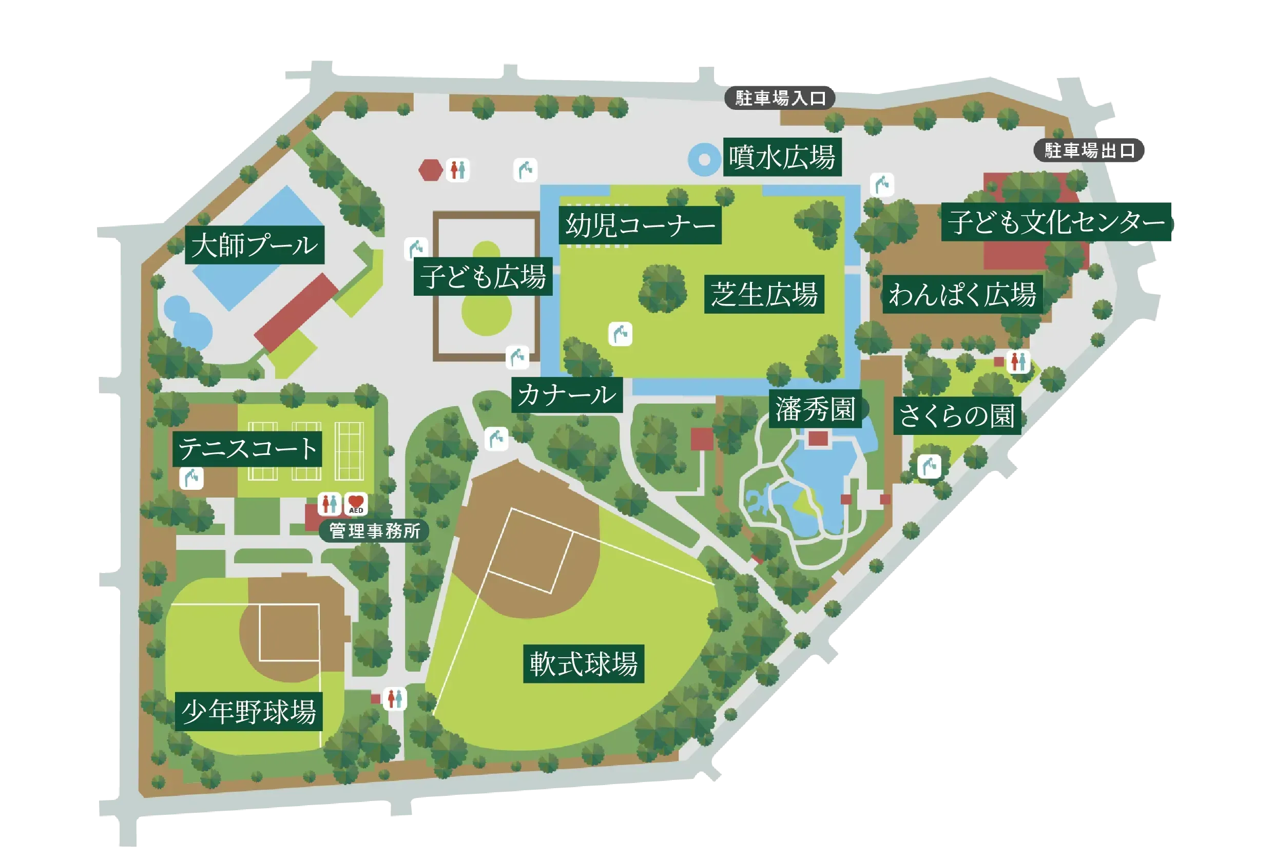 多彩な設備が揃う広大な「大師公園」をはじめ