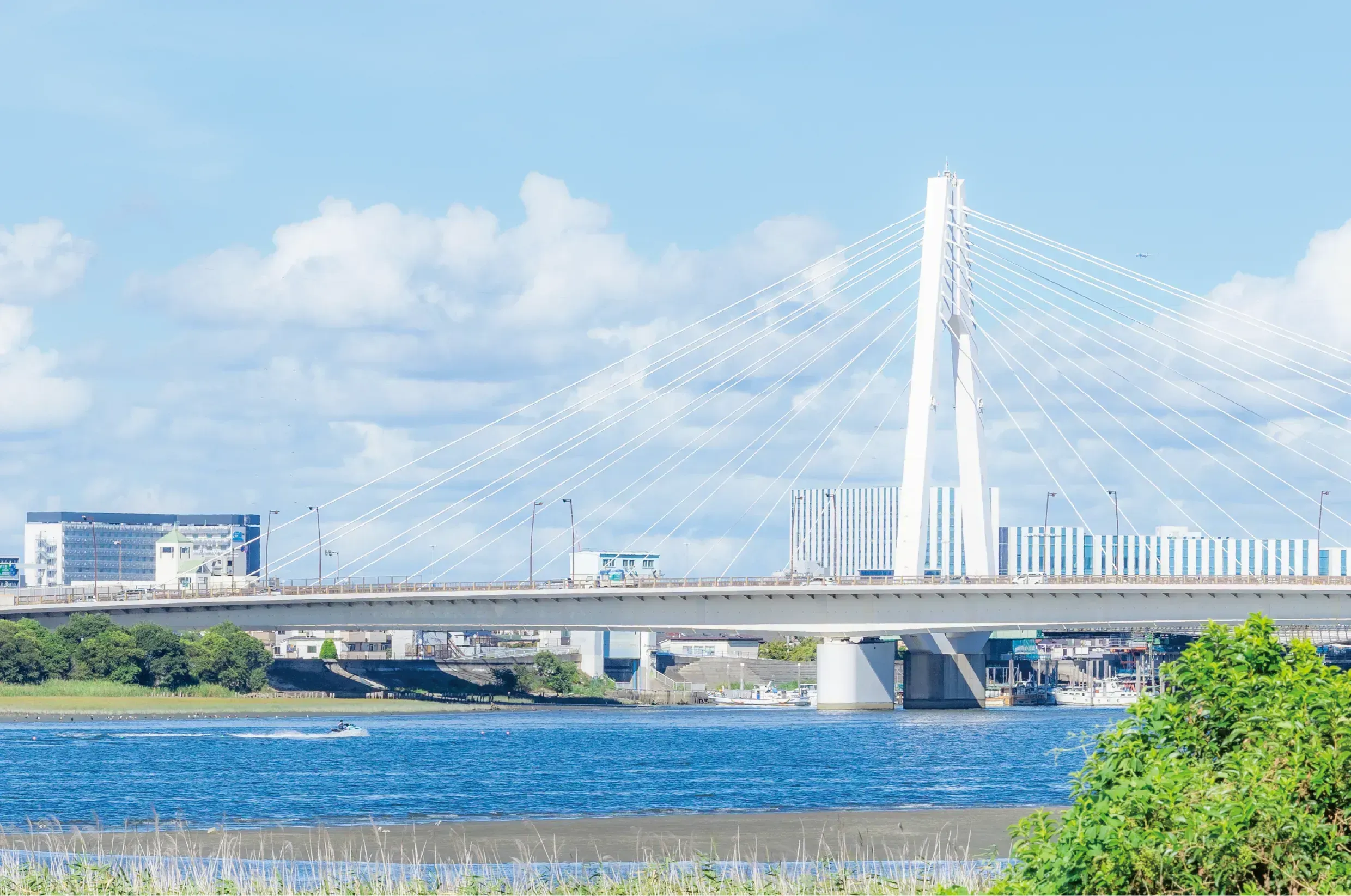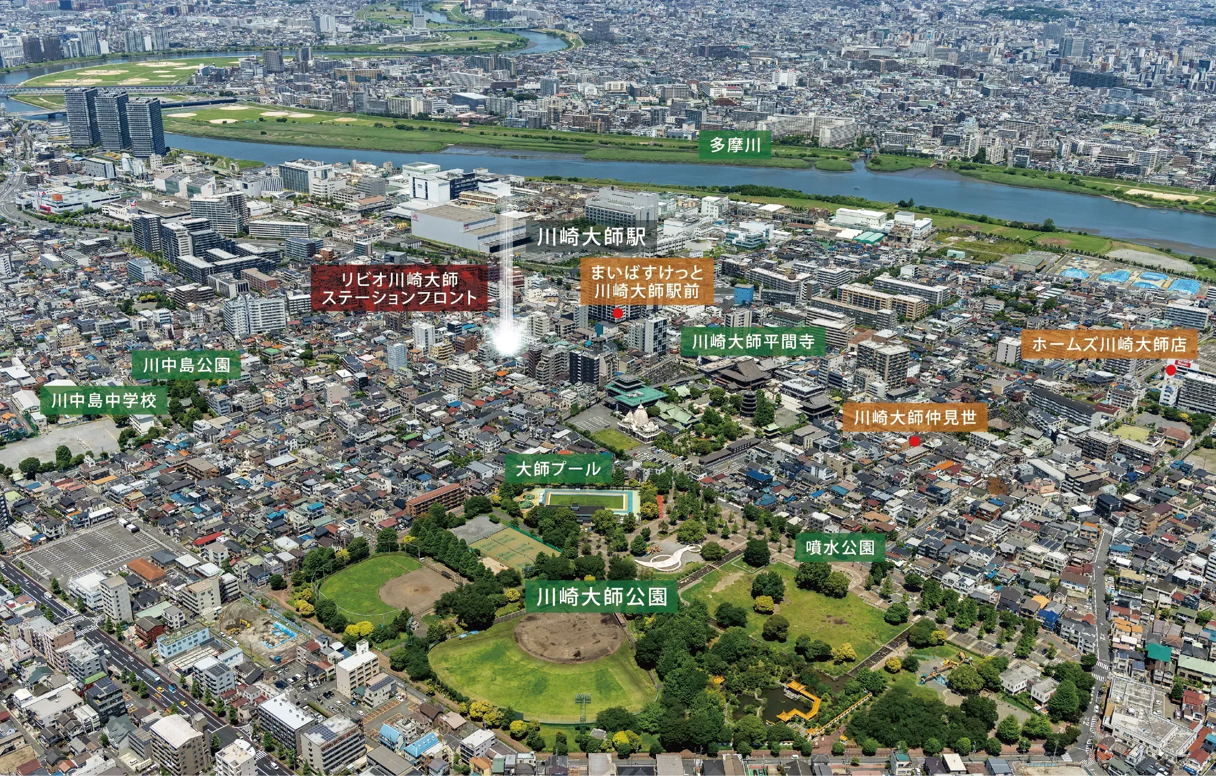 山梨県甲州市の水源より、東京都・神奈川県を流れ、東京湾に注ぐ一級河川。 緩やかな流れとなる下流部には公園やグランドが整備されており、 リビオ川崎大師ステーションサイトの付近にも、 軟式野球場や運動場を備えた多摩川緑地中瀬地区などがあります。
