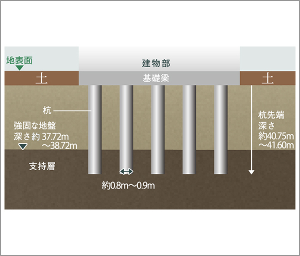 - 建物基礎は、強固な地盤の支持層にまで既製コンクリート杭を打ち込んでいます。地下約40.75m~41.60mまで打ち込んだ62本の杭が建物全体を支えていきます。
