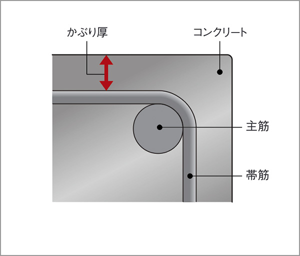 - 鉄筋コンクリートの梁・柱において、一番外側の鉄筋からコンクリート表面までは適正な厚さを確保し、耐久性を高めています。