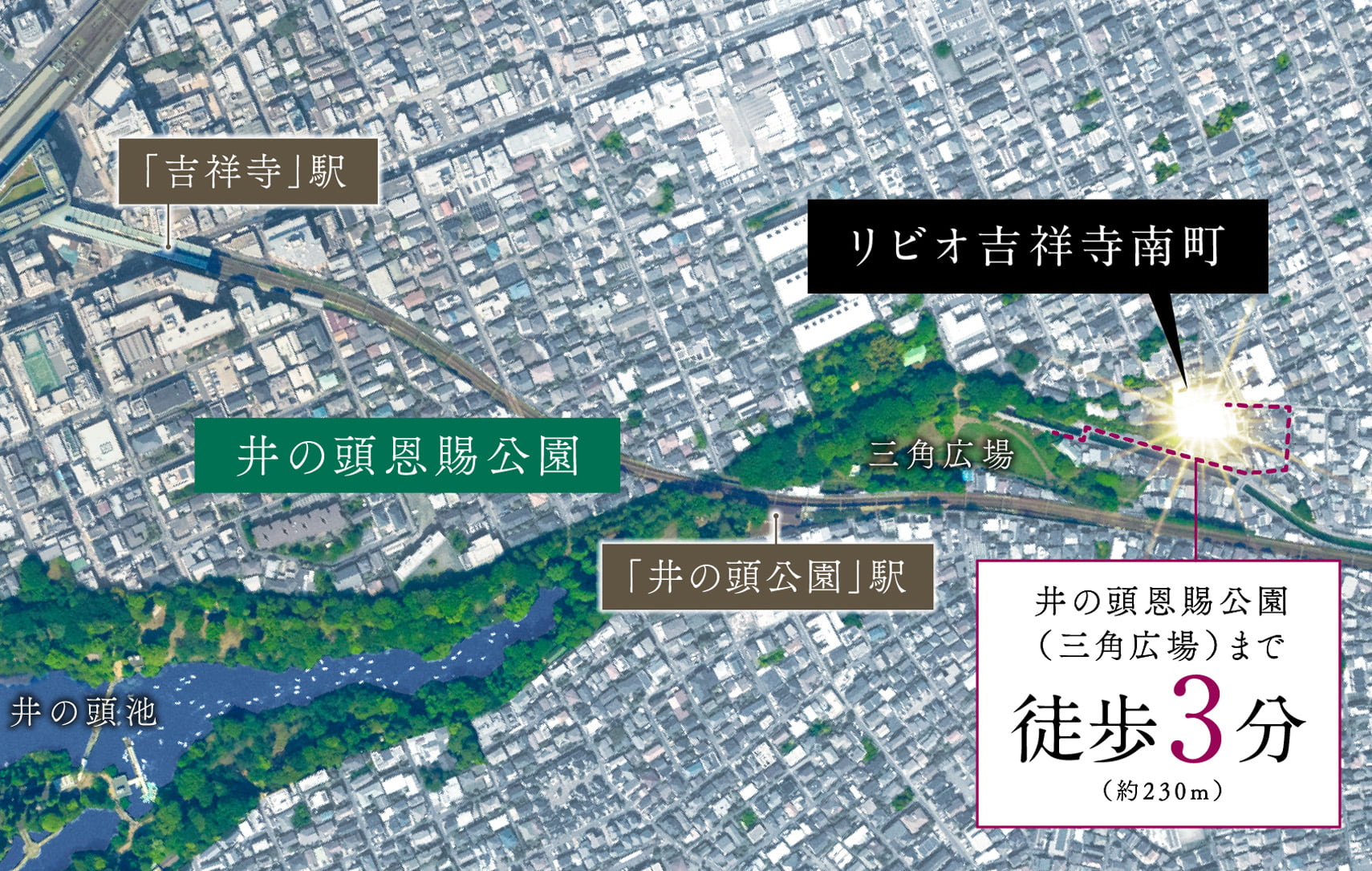 吉祥寺の象徴「井の頭恩賜公園」へ徒歩3分。