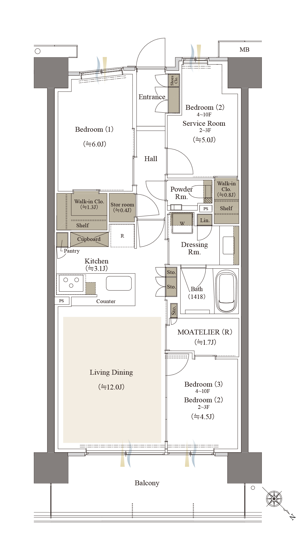 仕事や勉強、趣味や家事に没頭できる多目的スペース[モアトリエ]をご用意。ダウンライトやマルチメディアコンセントを完備し使い方や感性に合わせて、思い思いの個性ある空間を創造できます。