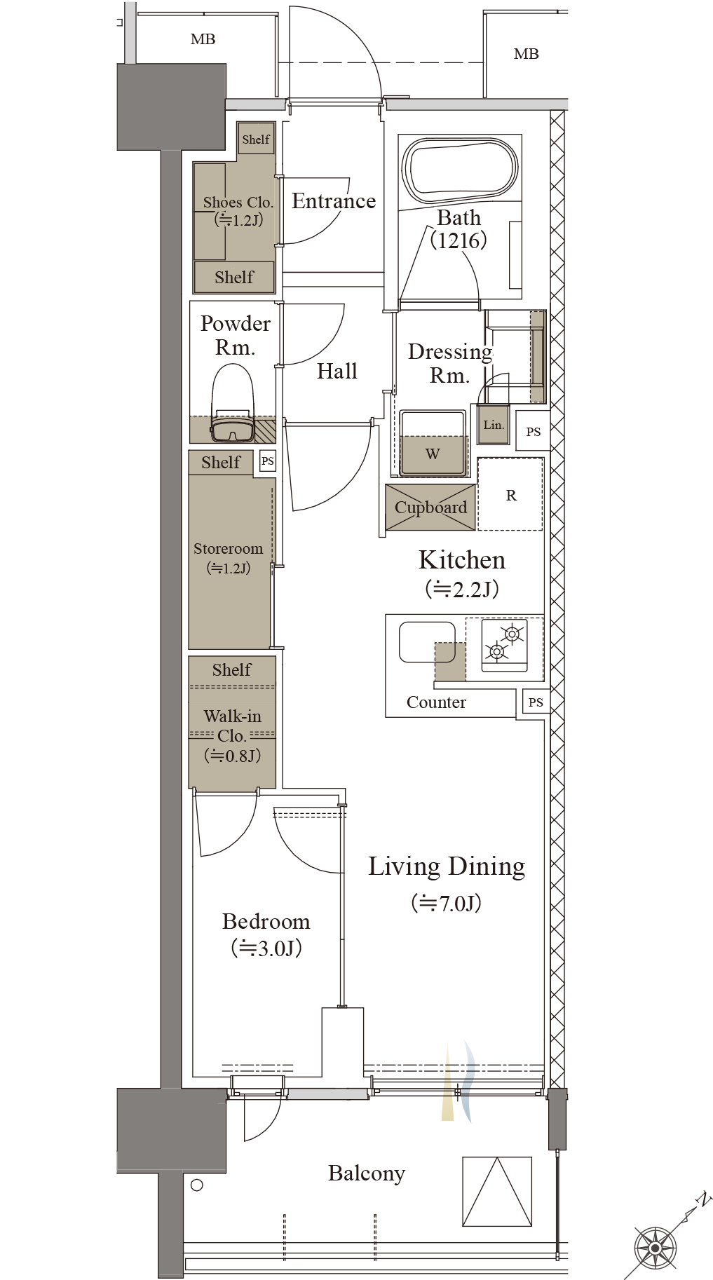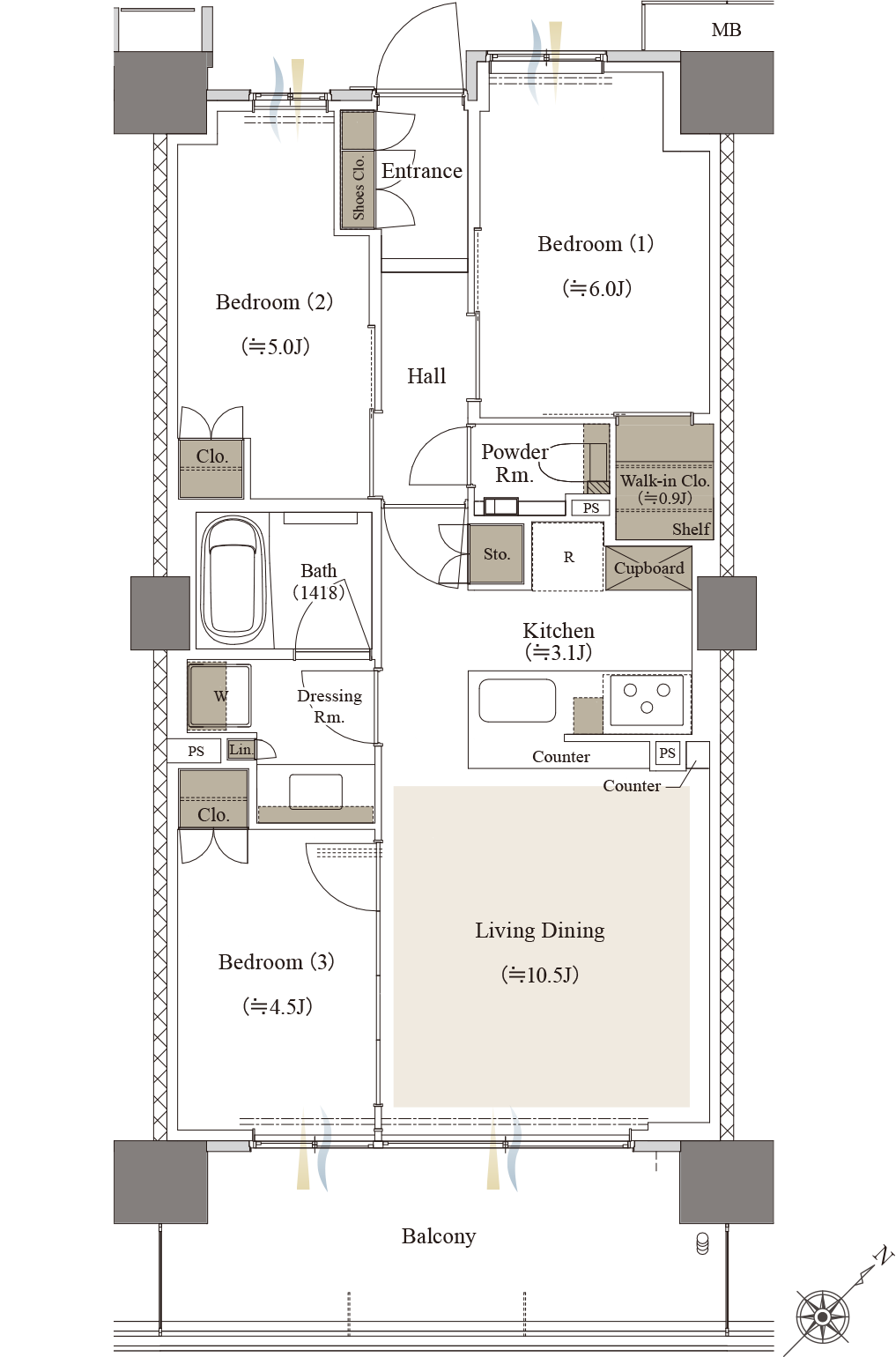 リビング・ダイニングの室内側に柱型が出ないアウトフレーム設計を採用。空間が広々となり、家具を置く際のデッドスペースが減らせるためスペースを有効活用できます。