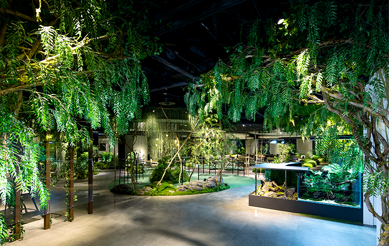 出来上がった空間に鉢植えやプランターを配置するのではなく、空間全体で自然の風景を再現するようなダイナミックなデザインが魅力。特殊な緑化技術を駆使して、緑で様々な空間を演出し、メンテナンスまで手がける。