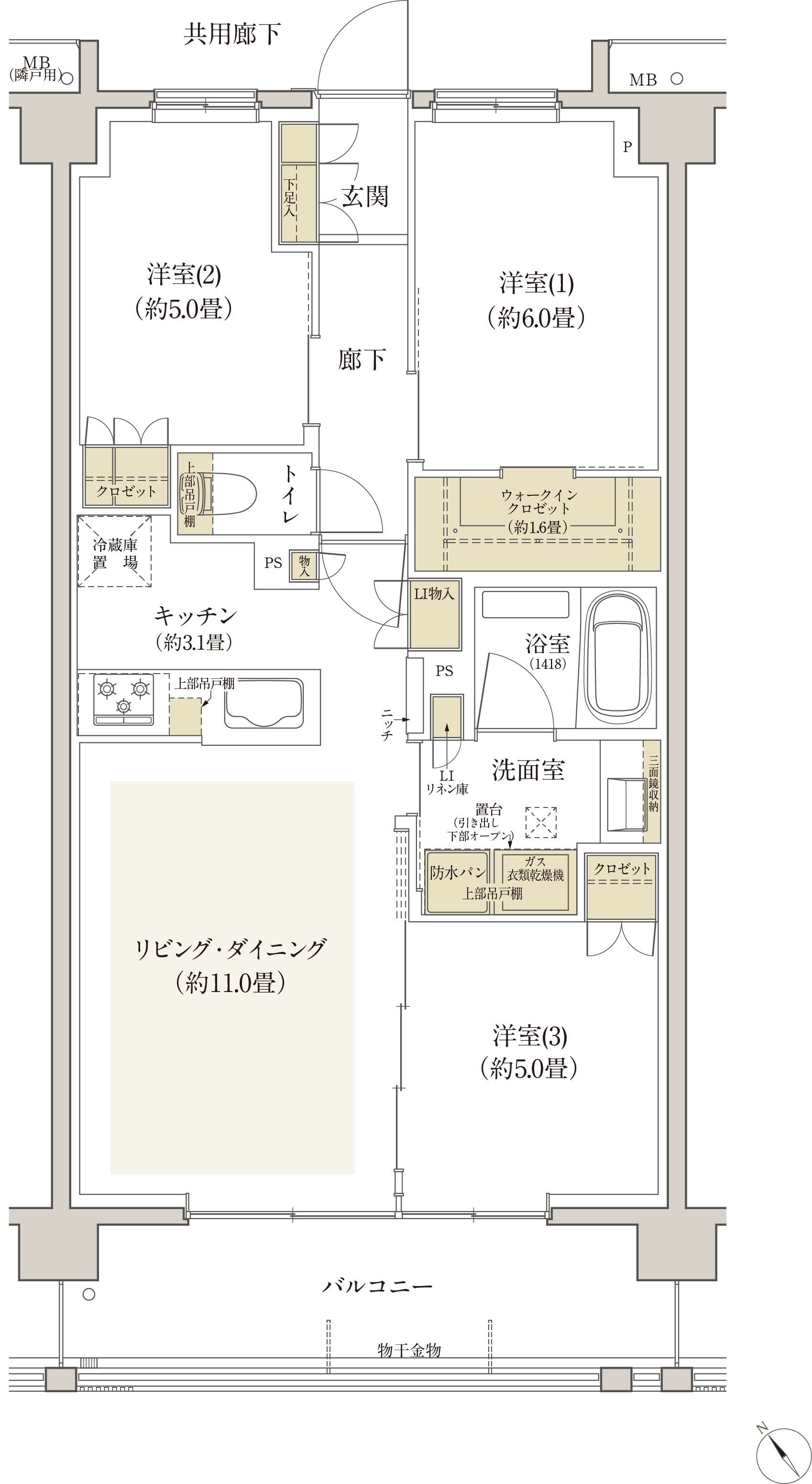 type専有面積: 63.56㎡3LDK各居室の広さをしっかりと確保した