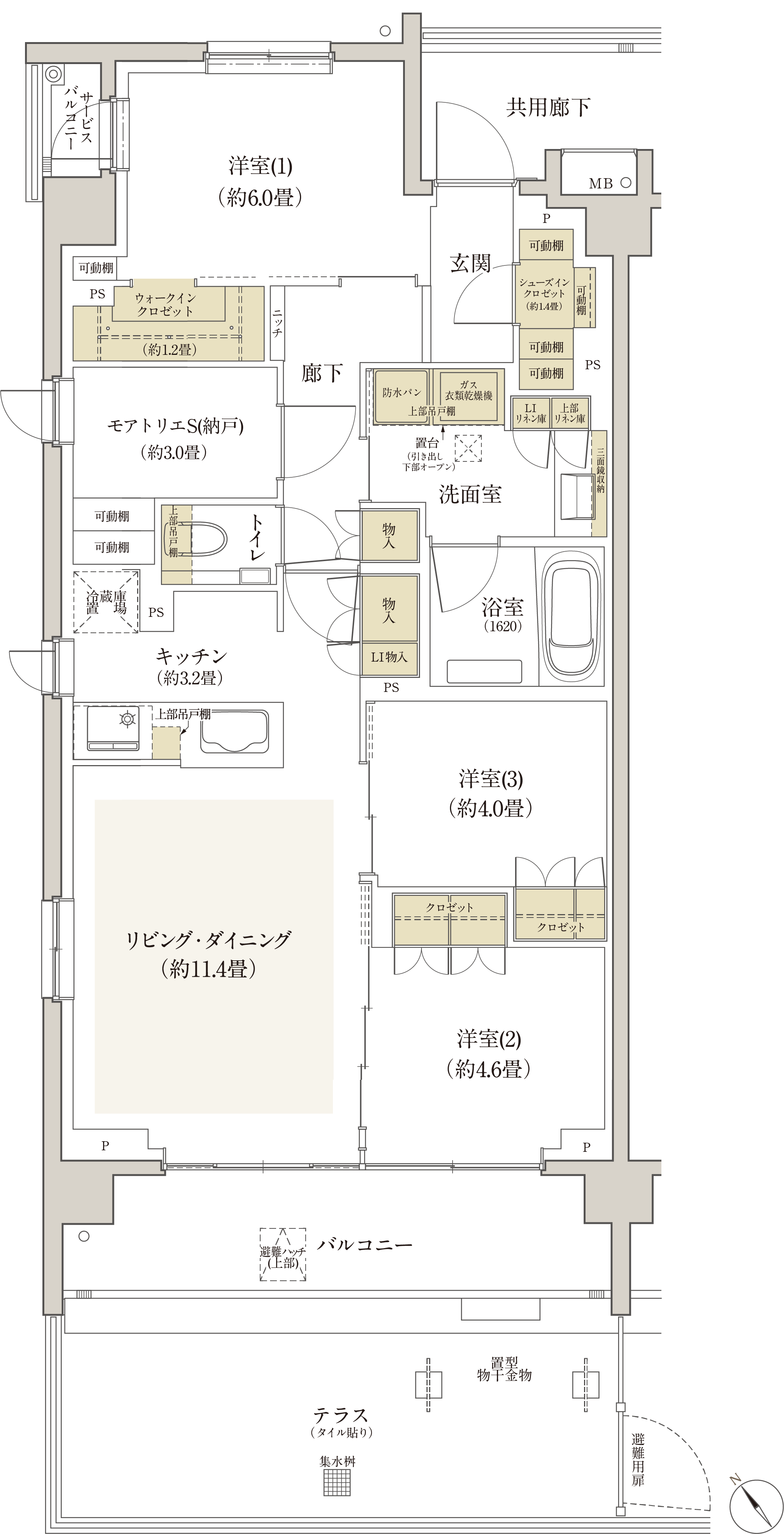 大容量のウォークインクロゼットやシューズインクロゼット、物入、納戸など多彩な大型収納をご用意。キッチンのパントリーや洗面室のリネン庫などを設置したプランも。
