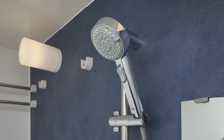 手元で操作できる一時止水機能付きシャワーヘッド。身体を洗う時にシャワーを止めて水の無駄を減らすことが可能です。