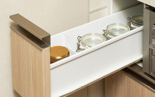 コンロ横にスライドタイプのスパイスラックを設置。調理中でもスムーズにスパイス類を出し入れできます。※ソフトクローズ無し
