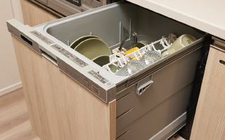 手洗いと比べ効率的に洗え、節水効果が期待できる食器洗い乾燥機を装備。