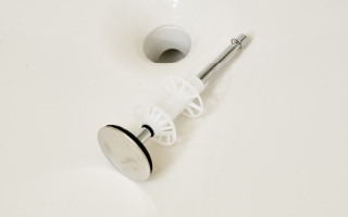 指でワンプッシュするだけで簡単に排水できるプッシュ式排水栓を採用しました。汚れや水アカがたまりやすい金具をなくしたフランジレス仕様です。