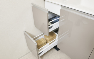 洗面化粧台にはスライド式収納をご用意しました。小物からストック品まで効率よく収納できます。