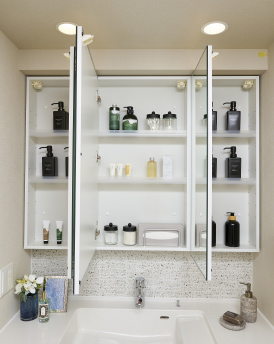 三面鏡裏は全面収納スペースになっています。洗面用具や化粧品などをたっぷりと収納でき、洗面台廻りがスッキリと片付きます。