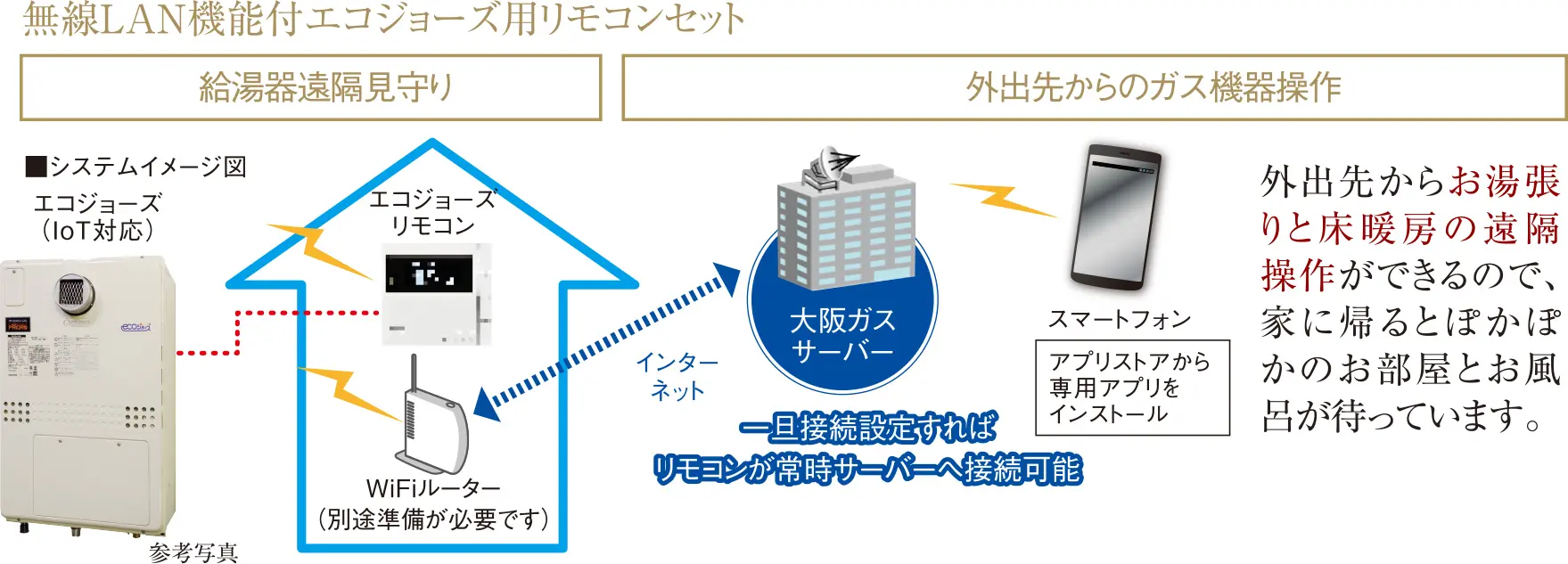 省エネ給湯器エコジョーズは、給湯と暖房に潜熱回収型の熱交換器を用い、従来は捨てていた燃焼ガスの熱までお湯づくりに再利用。給湯効率95%、暖房効率89%という高効率を実現しました。省エネルギーだから、光熱費がグンとおトク。